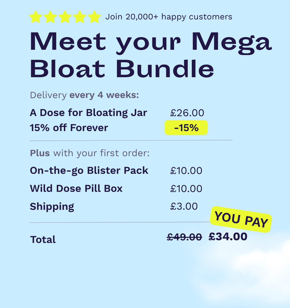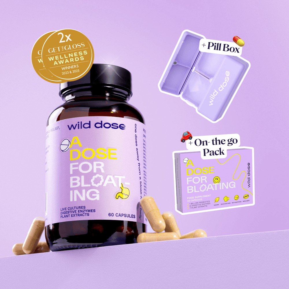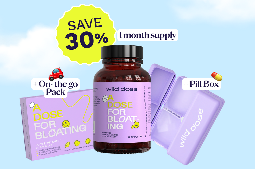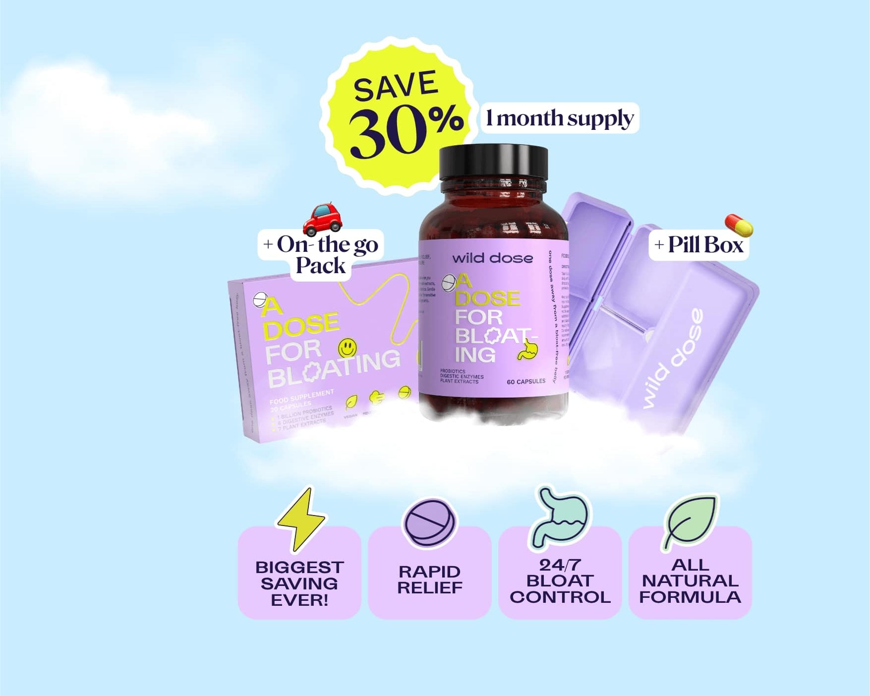 The VIRAL bloating remedy used by over 200,000 customers ✨ But this time SAVE 30% including a PLUS 1x TRAVEL PACK and our LIMITED EDITION PILLBOX. Stop bloating in it's tracks 👉TODAY👈